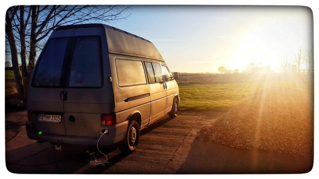Ich parkte also meinen Bus auf der Betonplatte. Im Sommer werde ich wieder ein paar Meter weiter vorn, auf dem Acker bzw. knapp daneben, stehen um der Sonne zu entgehen.